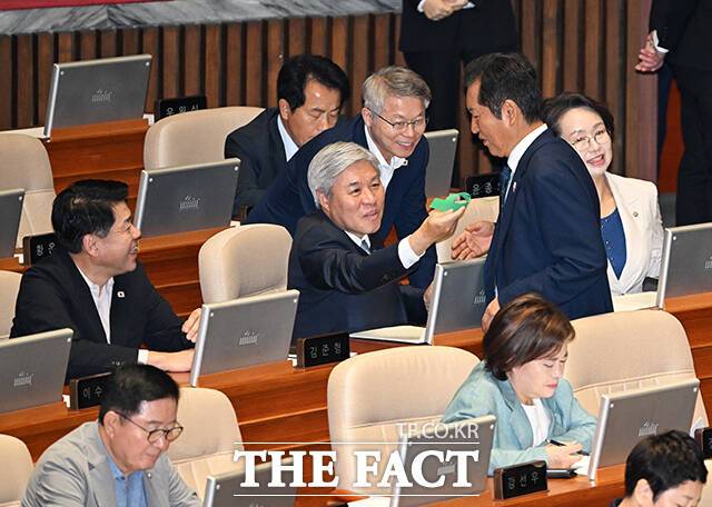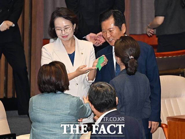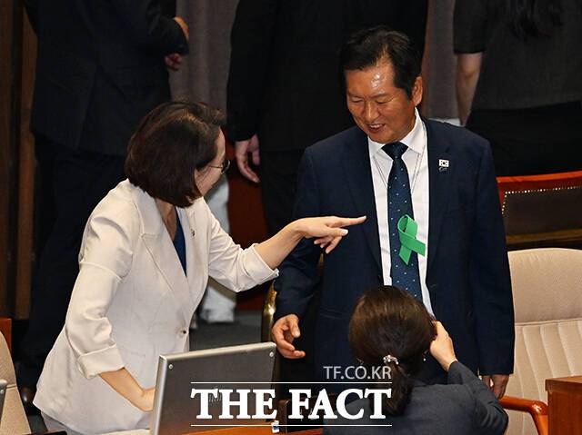 [더팩트ㅣ국회=배정한 기자] '오송 참사' 추모 의미의 초록 리본을 목에 건 정청래 더불어민주당 대표가 27일 오후 서울 여의도 국회에서 열린 본회의에 참석해 조국혁신당 의원들과 대화를 하고 있다.