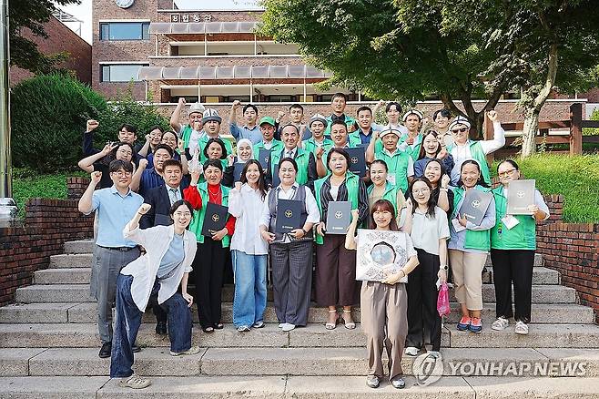 (서울=연합뉴스) 27일 경기 성남시 새마을운동중앙회에서 열린 키르기스스탄 초청 새마을교육 수료식에서 연수생들이 기념 촬영하고 있다. 2025.8.27 [새마을중앙운동회 제공. 재판매 및 DB 금지]