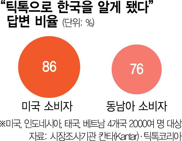시장조사기관 칸타(Kantar)와 틱톡이 발표한 ‘숏폼시대의 한류’ 백서에 따르면 미국과 동남아 소비자 10명 중 9명은 매일 틱톡에 접속하고 있다. 이 가운데 미국 소비자 86%와 동남아 소비자 76%는 ‘틱톡을 통해 한국 문화를 알게 됐다’고 답했다. 틱톡이 글로벌 소비자에게 한국 문화를 전파하는 주요 통로로 자리 잡았음을 보여준다.