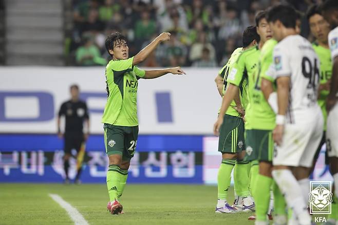 전북은 4-3-3 전형으로 맞선다. 김정훈 골키퍼를 비롯해 김태환, 김영빈, 홍정호, 김태현이 수비를 구축한다. 강상윤과 김진규, 박진섭이 중원을 지키고 송민규, 이승우가 측면, 최전방에 콤파뇨가 나와 득점을 노린다. 벤치에 송범근, 최철순, 감보아, 한국영, 권창훈, 이영재, 티아고, 전진우, 츄마시가 준비한다.