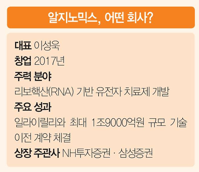 일각에서는 알지노믹스가 조 단위 몸값을 넘볼 수 있다는 관측도 나온다. 지난해 말 프리 IPO 투자 유치 당시 평가받은 기업가치는 약 1100억원. 만약 조 단위 몸값을 인정받는다면 불과 1년도 안 돼 기업가치가 10배가량 뛰는 셈이다.