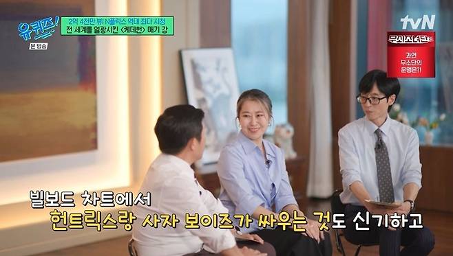매기 강은 '케데헌'의 인기에 관해 "좀 이상하다. 믿어지지 않는다. 영화 하나가 이렇게 인기 있을 수 있다는 것도 몰랐다"라며 "이 자리도 믿기지 않는다. 제가 '유퀴즈'를 엄청 많이 봤는데, 이런 쇼에 나온다는 것 자체가 신기하다"라고 고백했다.