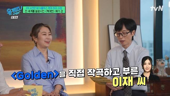 '골든(Golden)'을 작곡하고 부른 이재는 10년간 SM 연습생이었다고. 매기 강은 이재에 관해 "뉴욕에서 '골든' 녹음하는 걸 봤는데, 높은 음역대를 2~30번 연달아 하더라. 부르기 엄청 어려운 곡인데, 이재 씨한테 일부러 어렵게 만들어달라고 했다. 높은 음역대의 노래를 들으면 우리 기분이 '업'되지 않냐. 벅차오르는 기분을 주는 노래를 만들고 싶었다"라고 밝혔다.