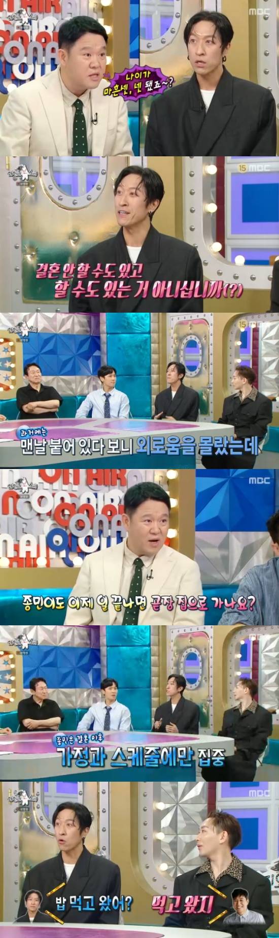 올해 45세라는 빽가의 말에 '라스' MC들도 "결혼 계획이 없는거냐"고 물었고, 빽가는 "잘 모르겠습니다"라고 얼버무렸다. 이어 "갈 수도 있고, 안 갈 수도 있는 것 아니냐. 종민이 형이 물어보면 그냥 모르겠다고 대답하라고 했다"면서 웃었다.