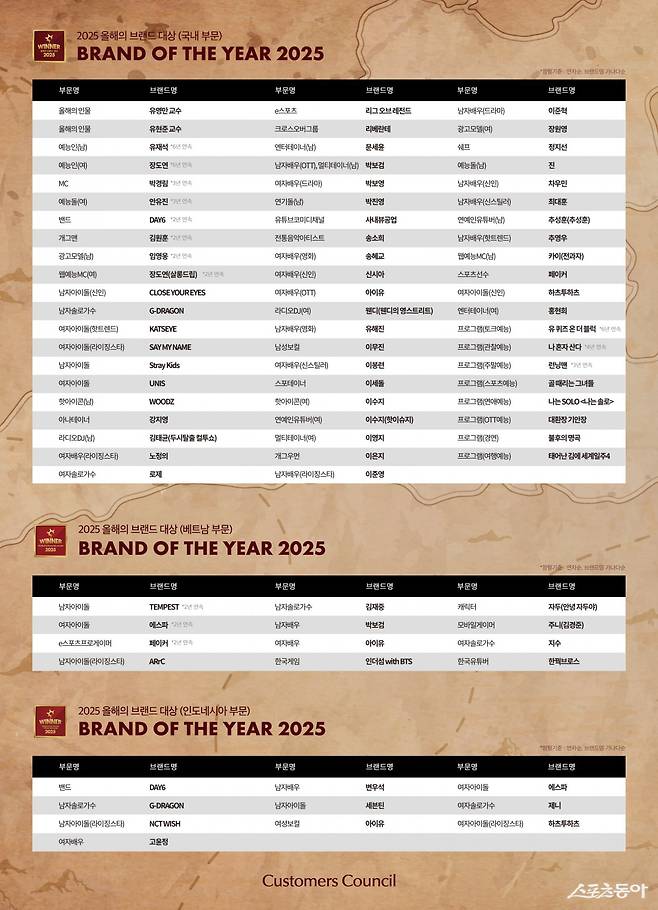 이외에도 인도네시아에서는 세븐틴(남자아이돌), 변우석(남자배우), 고윤정(여자배우), 제니(여자솔로가수) 등이 수상의 영예를 안았다. 베트남에서는 TEMPEST(남자아이돌), 김재중(남자솔로가수), 아이유(여자배우), 지수(여자솔로가수) 등이 브랜드 파워를 입증했다. 프로그램 부문에서는 tvN ‘유 퀴즈 온 더 블럭’이 6년 연속 토크예능 부문 대상을 수상하며 최장 기록을 세웠다. 빌 게이츠, 스칼렛 요한슨 등 세계적 인사까지 출연시킨 이 프로그램은 국경과 세대를 아우르는 대화의 장으로 평가받는다.