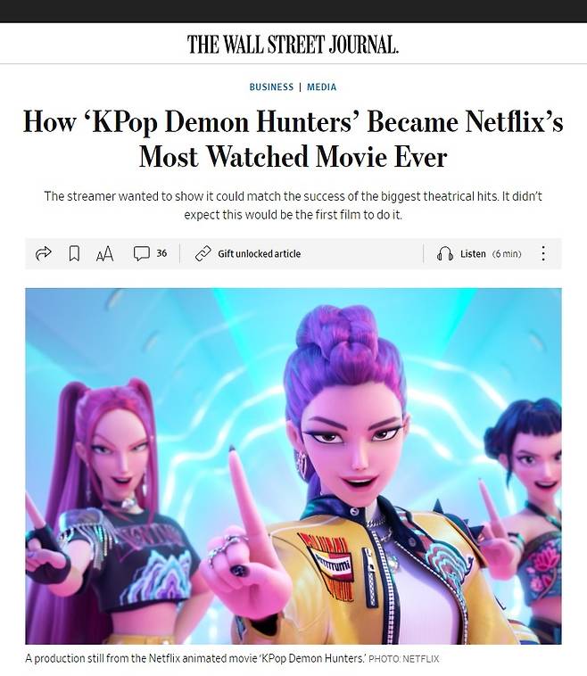 | ▲ <케이팝 데몬 헌터스> 인기를 분석한 <월스트리트저널> 기사 |