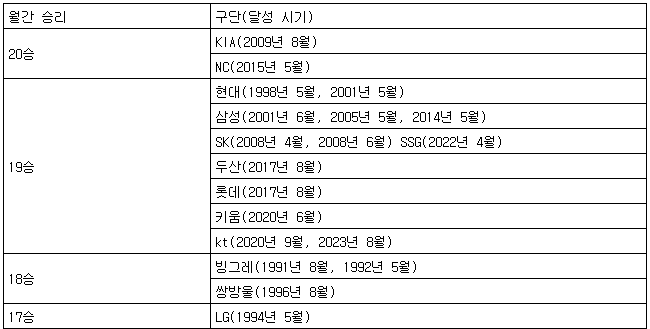 이 부문 기록은 KIA 타이거즈가 2009년 8월, NC 다이노스가 2015년 5월에 작성한 20승이다.
