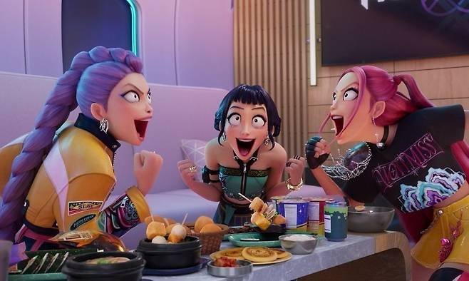 영화 '케데헌'은 케이팝 그룹 헌트릭스 루미, 미라, 조이가 화려한 무대 뒤 세상을 지키는 숨은 영웅으로 활약하는 이야기를 담은 액션 판타지물이다. 헌트릭스는 악령 세계에서 탄생한 보이그룹 사자 보이즈와 인기 경쟁을 벌이며 그들의 정체를 밝히고 노래로 세상을 보호한다. 중독성 강한 OST와 탄탄한 서사, 한국의 배경을 높은 싱크로율로 반영한 섬세함으로 열풍을 이끌어냈다.