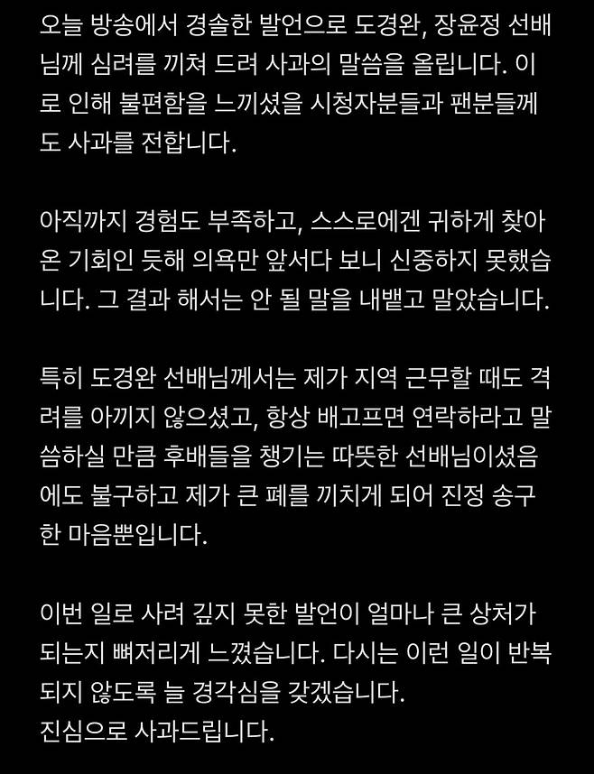 한편 논란이 커지자 김진웅는 아나운서는 자신의 SNS에 "도경완, 장윤정 선배님께 심려를 끼쳐 드려 사과의 말씀을 올린다"며 "아직까지 경험도 부족하고, 스스로에겐 귀하게 찾아온 기회인 듯해 의욕만 앞서다 보니 신중하지 못했다. 그 결과 해서는 안 될 말을 내뱉고 말았다"며 사과했다.