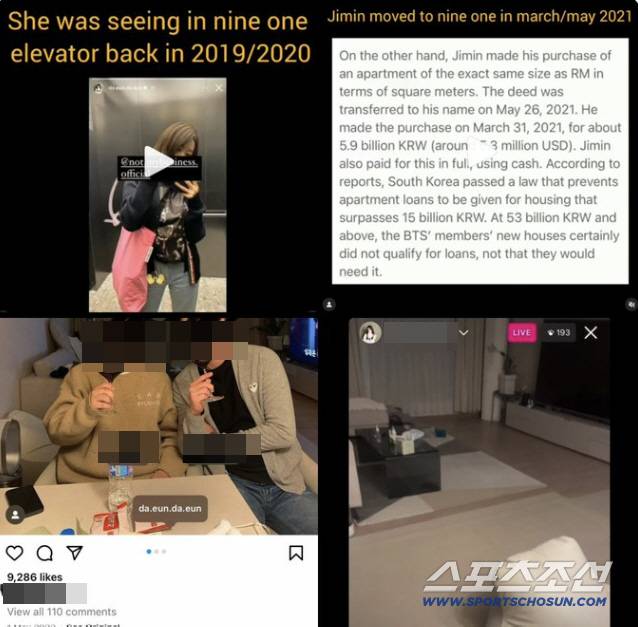 송다은은 최근 자신의 계정에 지민과의 집데이트 영상을 공개해 파란이 일었다. 공개된 영상에는 지민이 "아 깜짝이야. 나 들어오는 거 알았어? 일부러 말 안하고 온건데"라며 엘리베이터에서 내리는 모습이 담겼다. 이 과정에서 '나인원 한남'이라고 적힌 엘리베이터 내부 인테리어가 공개됐고, 나인원 한남은 지민이 거주 중인 곳이라 뜨거운 관심이 집중됐다.