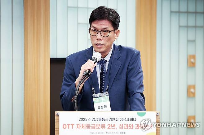 (서울=연합뉴스) 임화영 기자 = 최승현 넷플릭스서비스코리아 총괄이 28일 서울 중구 프레스센터에서 열린 OTT 플랫폼 청소년 보호 강화를 위한 영상물등급위원회-자체등급분류사업자 공동협력 선언식에서 축사를 하고 있다. 2025.8.28