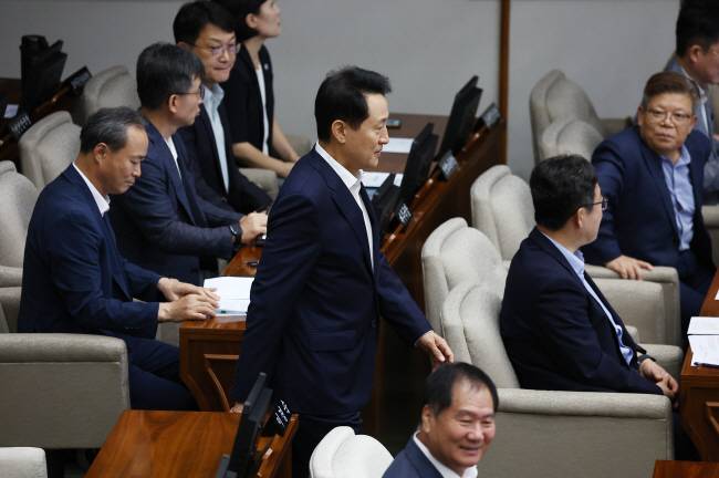 [오세훈 서울시장이 27일 서울 중구 서울시의회에서 열린 제322회 시의회 임시회 개회식에 참석하고 있다. (사진=연합뉴스)]