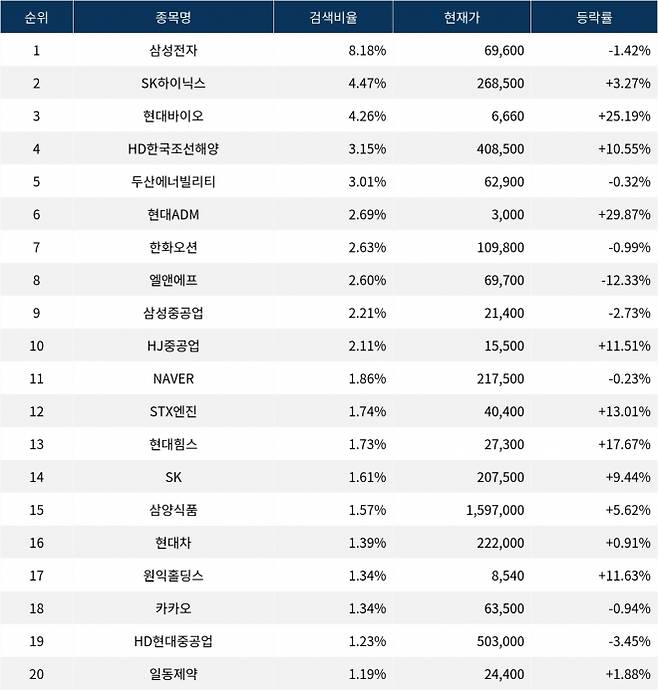 이어 검색비율 2위의 SK하이닉스(000660)는 상승률 3.27%로 상승 마감했다. 검색비율 3위의 현대바이오(048410)는 25.19% 급등했다. 검색비율 4위 HD한국조선해양(009540)은 10.55% 상승했다. 검색비율 5위 두산에너빌리티(034020)는 0.32% 하락하며 약보합으로 마감했다.