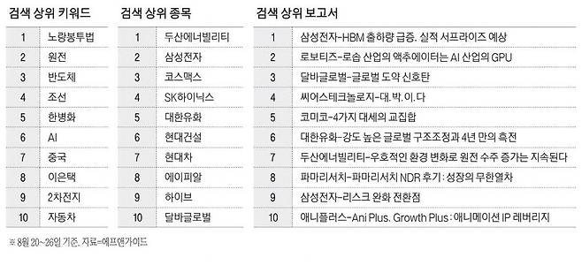 지난 일주일 동안 투자자들의 최대 관심사는 노란봉투법의 산업 영향과 원전 대장주 두산에너빌리티의 주가 움직임이었다. '9만전자' 목표가를 제시한 보고서도 투자자들의 눈길을 사로잡았다. 금융정보업체 에프앤가이드에 따르면 8월 20~26일 투자자들이 가장 많이 검색한 키워드는 '노란봉투법'(529회)이었다. 2위 '원전'(247회)과 비교하면 2배 이상의 검색량이 몰렸다.