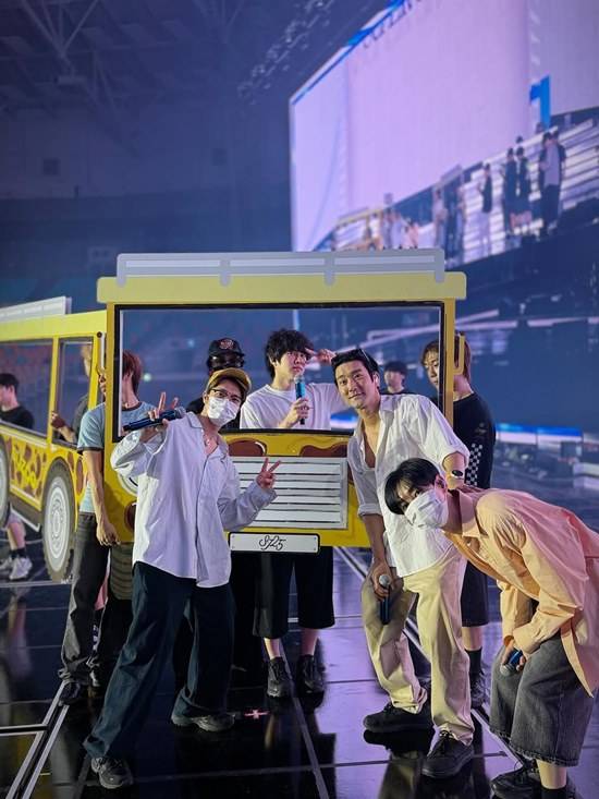 더하여 슈퍼주니어의 멤버와 무대 리허설 전 찍은 단체 사진도 눈길을 끈다. 최근 '가짜 고소장 접수'로 팬들에게 큰 충격을 주었던 슈퍼주니어의 멤버 희철과도 브이를 하며 불화설이 장난이었음을 드러내고 있다.