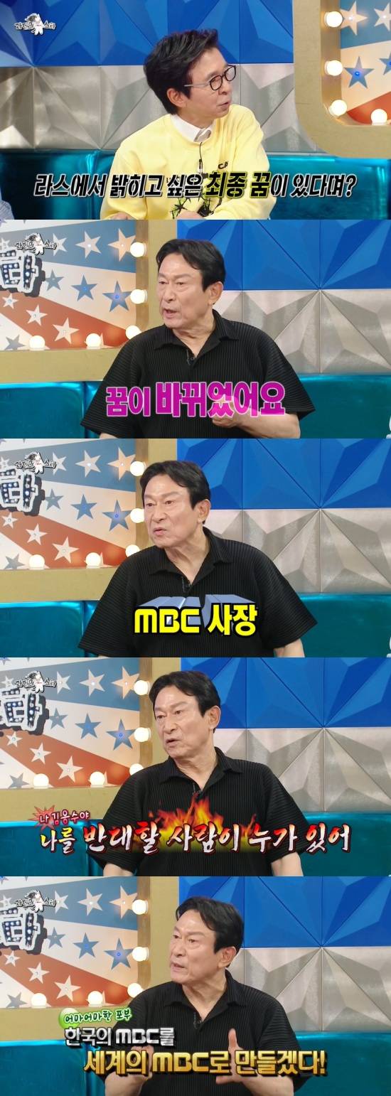 '라스'를 통해 새로운 꿈을 밝히겠다고 말한 것에 대해 김응수는 "작년 MBC 연예대상에서 나오라고 하더라. 저는 대상인 줄 알고 나갔는데 시사·교양 특별상을 받았다. 그 때 집에 돌아가면서 '올해는 그럼 대상을 받아볼까?' 싶었는데 꿈이 바뀌었다"면서 MBC 사장이 되고 싶다고 언급했다.