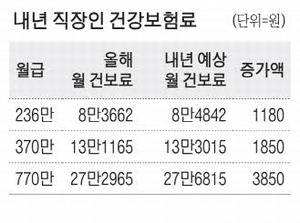 월급 770만원을 받는 직장인의 월 건강보험료가 올해 54만5930원에서 내년 55만3630원으로 7700원이 오른다.