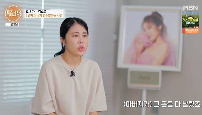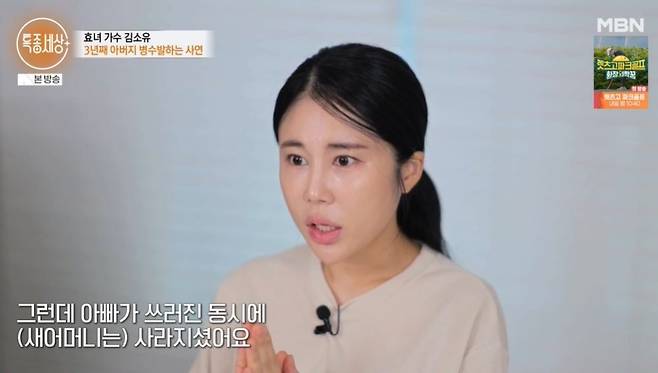 김소유는 "병원비 생각에 어느 순간 잠도 안 오고, 아침이 되는 게 너무 싫었다. 아빠가 저질러 놓은 일은 해결해야 하니까"라며 고된 간병에 점점 지쳐서 우울증까지 왔다고 고백했다.