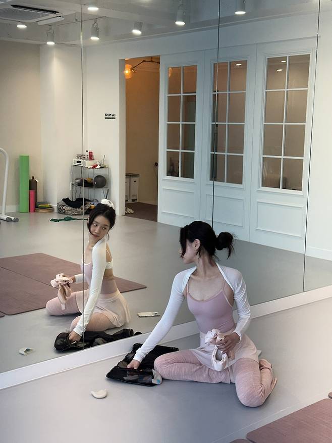 사진 속 박규영은 연핑크색 발레 레오타드와 스커트, 레깅스에 가디건을 걸친 차림으로 발레 동작을 선보이고 있다.
