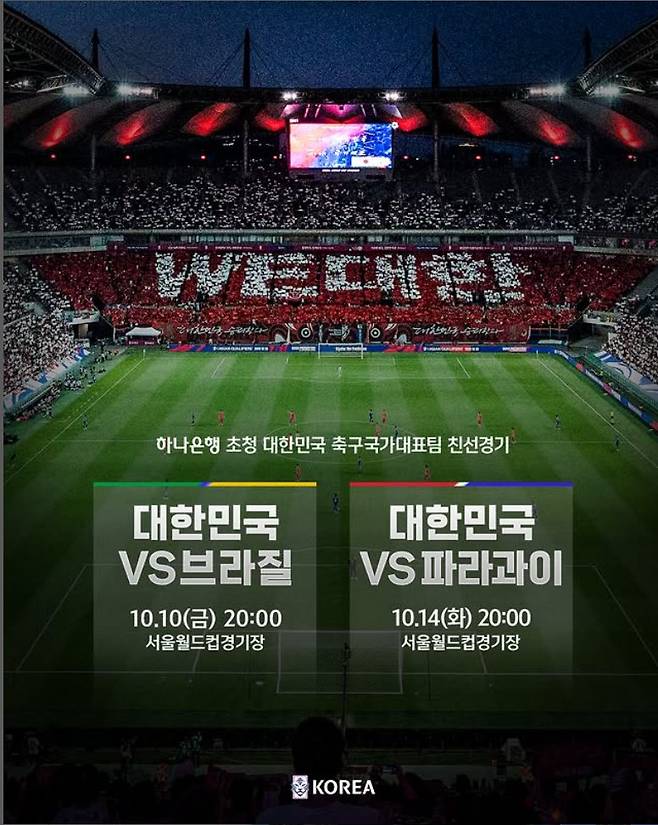 홍명보 감독이 이끌고 있는 대한민국 축구 국가대표팀은 오는 10월 10일 브라질과 친선전을 가지고, 14일엔 파라과이를 상대한다. 두 경기 모두 서울월드컵경기장에서 열린다.