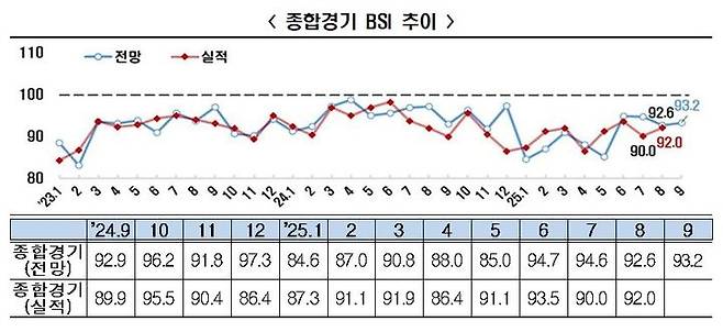 8월 BSI 실적치는 92.0로 조사됐다. 2022년 2월(91.5)부터 3년 7개월 연속 부진으로 나타나 기업들의 실적 악화가 장기화되는 모습이다.