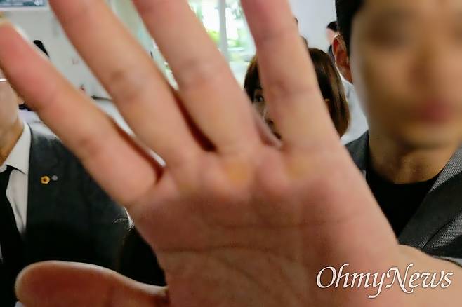 | ▲ 나경원 국민의힘 의원이 지난 27일 국회 의원회관에서 열린 '청년안심주택 보증금 미반환 사태' 긴급 간담회 직후 <오마이뉴스>의 '계엄 당시 윤석열과의 통화', '계엄 해제 표결 불참 이유', '내란 선동 혐의' 등의 질문을 받자, 그의 보좌진이 카메라를 가리고 있다. |