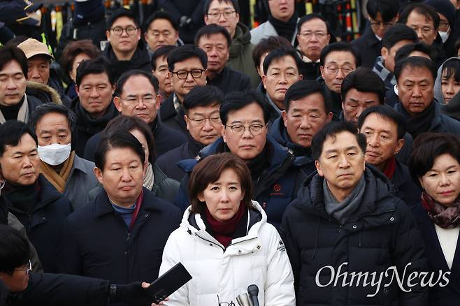 | ▲ 국민의힘 나경원, 김기현 의원 등이 지난 1월 6일 오후 서울 용산구 한남동 대통령 관저 정문 앞에서 ‘내란수괴’ 혐의 윤석열 대통령에 대한 공수처의 체포영장 집행을 막기 위해 대기한 뒤 기자회견을 하고 있다. |