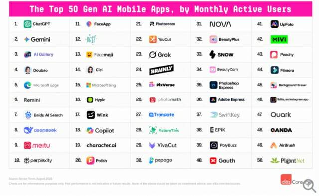 모바일 리스트에서는 14개의 새로운 업체가 더 많이 등장했는데, 이는 앱스토어가 '챗GPT(ChatGPT) 복사품'들을 단속하면서 더 독창적인 모바일 앱들이 자리를 차지할 수 있는 공간이 생겼기 때문이다. 리포트는 월간 고유 방문자 수를 기준으로 한 상위 50개 AI 우선 웹 제품과 월간 활성 사용자 수를 기준으로 한 상위 50개 AI 우선 모바일 앱을 순위화했다.