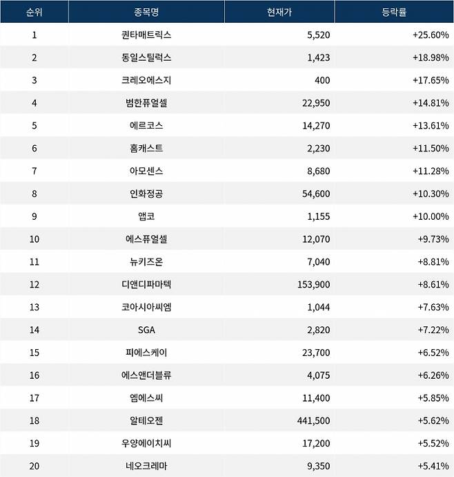 6위 홈캐스트(064240)는 현재가 2,230원으로 11.50% 상승 중이다. 7위 아모센스(357580)는 현재가 8,680원으로 11.28% 상승 중이다. 8위 인화정공(101930)은 현재가 54,600원으로 10.30% 상승 중이다. 9위 앱코(129890)는 현재가 1,155원으로 10.00% 상승 중이다. 10위 에스퓨얼셀(288620)은 현재가 12,070원으로 9.73% 상승 중이다.