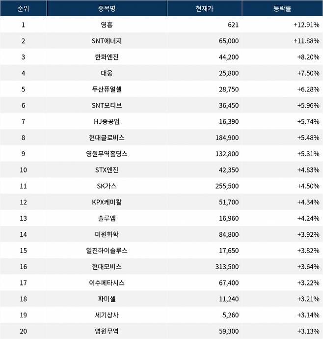 6위 SNT모티브(064960)는 현재가 36,450원으로 5.96% 상승 중이다. 7위 HJ중공업(097230)은 현재가 16,390원으로 5.74% 상승 중이다. 8위 현대글로비스(086280)는 현재가 184,900원으로 5.48% 상승 중이다. 9위 영원무역홀딩스(009970)는 현재가 132,800원으로 5.31% 상승 중이다. 10위 STX엔진(077970)은 현재가 42,350원으로 4.83% 상승 중이다.