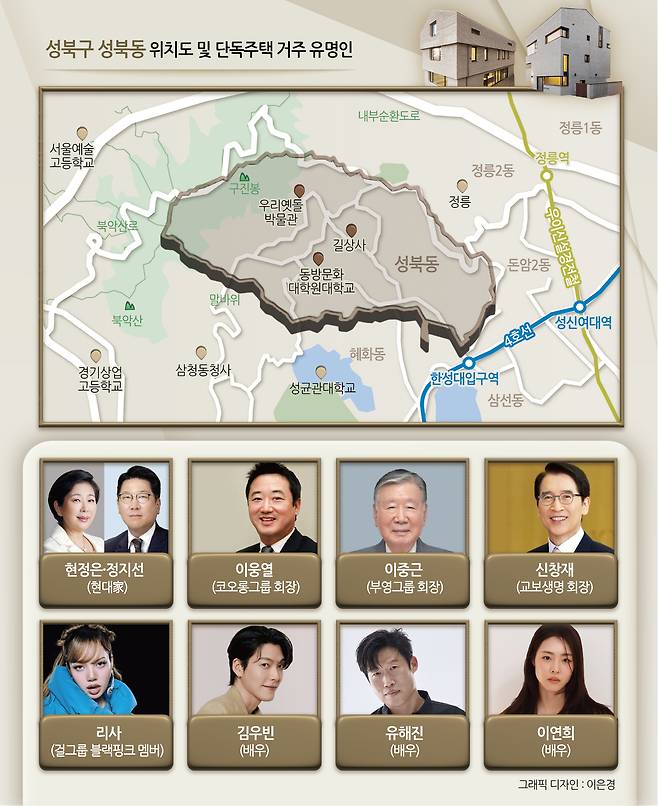 신흥 자산가들도 유입된다. 지난 2022년엔 걸그룹 블랙핑크 멤버 리사가 고(故) 신격호 롯데그룹 명예회장의 외손녀인 장선윤 롯데뉴욕팰리스 전무가 살던 성북동 단독주택을 75억원에 매입해 화제가 되기도 했다. 배우 유해진도 2023년 성북동 단독주택을 45억원에 전액 현금 매수했다.