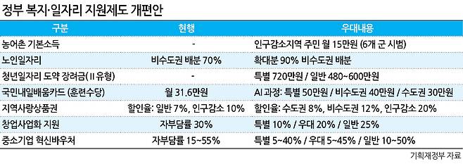 노동 안전망 보강도 본격 추진된다. 산재 예방 설비·인력 지원 규모를 1만1000개소에서 1만7000개소로 확대하고, 도산 사업장에서 체불된 임금을 정부가 우선 지급하는 ‘체불임금 대지급’ 기간은 3개월에서 6개월로 늘린다. ‘워라벨+4.5 프로젝트’를 통해 주 4.5일제를 도입하는 중소기업에 월 20만~50만원의 장려금도 지급한다. 국민취업지원제도 지원인원을 4만5000명 많은 35만명으로 늘리고, 구직촉진수당도 월 50만원에서 60만원으로 인상해 취약계층 구직활동을 지원할 계획이다.