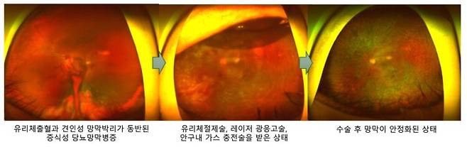 증식된 막에 의해 망막이 잡아 당겨지는 견인성 망막박리가 동반된 경우에도 유리체절제술을 통해 막을 제거하고, 필요하면 안구내 가스 충전술 혹은 안구내 실리콘오일 충전술을 시행하게 됩니다.