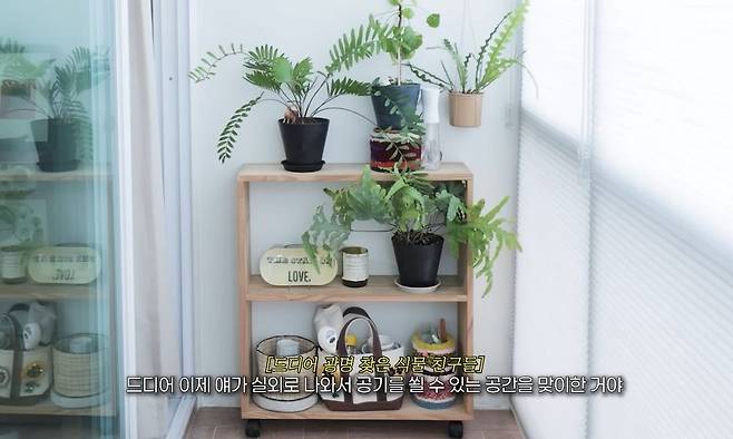 명상 공간으로 꾸며진 발코니에는 화분이 가득했다. 그는 "드디어 이제 얘가(화분) 실외로 나와서 공기를 쐴 수 있는 공간을 맞이했다. 다 있었던 거고 새로 산 건 없다"라고 만족감을 드러냈다.