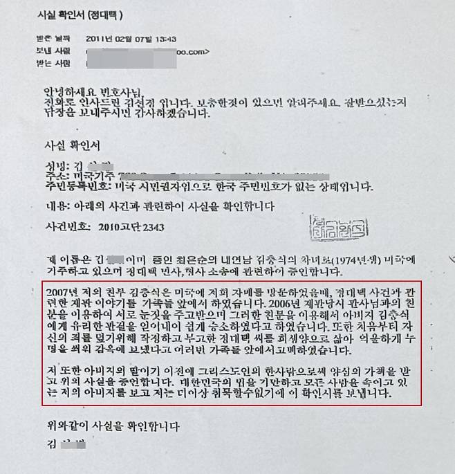 | ▲ 지난 2011년 2월 7일 김충식씨의 차녀가 정대택씨측에 보낸 이메일. '이익금 분배 약정서 사건'에서 김충식씨가 판사와의 친분을 이용해 유리한 판결을 얻어냈다고 고백했다는 내용이 들어 있다. |