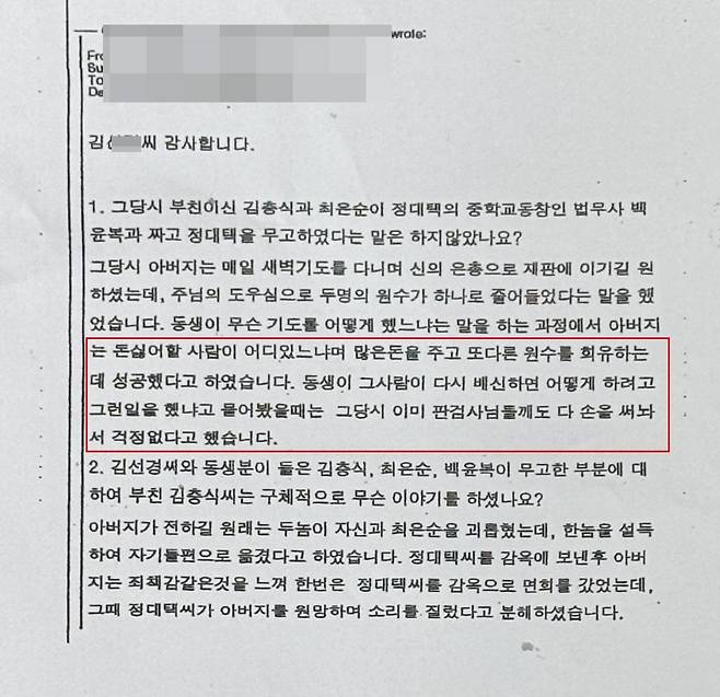 | ▲ 김충식씨의 차녀가 지난 2011년 2월 9일 정대택씨 측에 보낸 이메일. 차녀는 "아버지는 항상 주변의 법조계 특히 판검사님들께 향응을 제공하고 도움을 많이 받으셨"다고 했다고 전했다. |