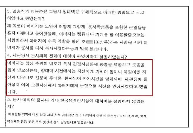 이어 "그때까지만 해도 아버지가 도움을 준 이가 최은순인지 몰랐다"라며 "정대택에게 돌아가는 배당금을 최소화시킨 공을 고마움의 댓가(커미션)로 받았다고 하였다"라고 거듭 설명했다.