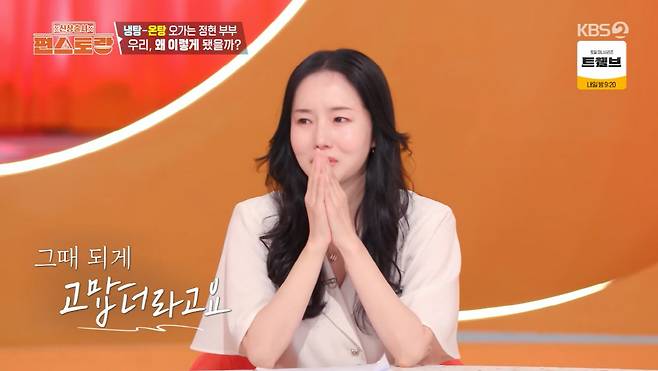 이정현과 남편은 "결혼 전까지는 한 번 도 안 싸웠었다. 근데 한 번 싸우고 나니까 서로 조심하던 게 없어졌다"라고 말했고, 이정현은 "화병이 나서 그런거다"라고 말해 웃음을 자아냈다.