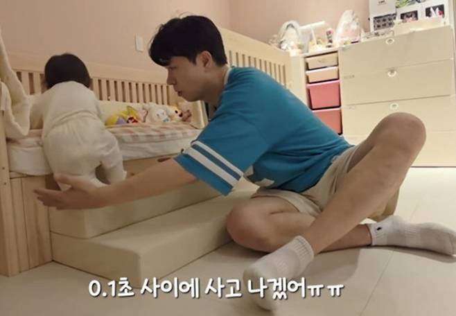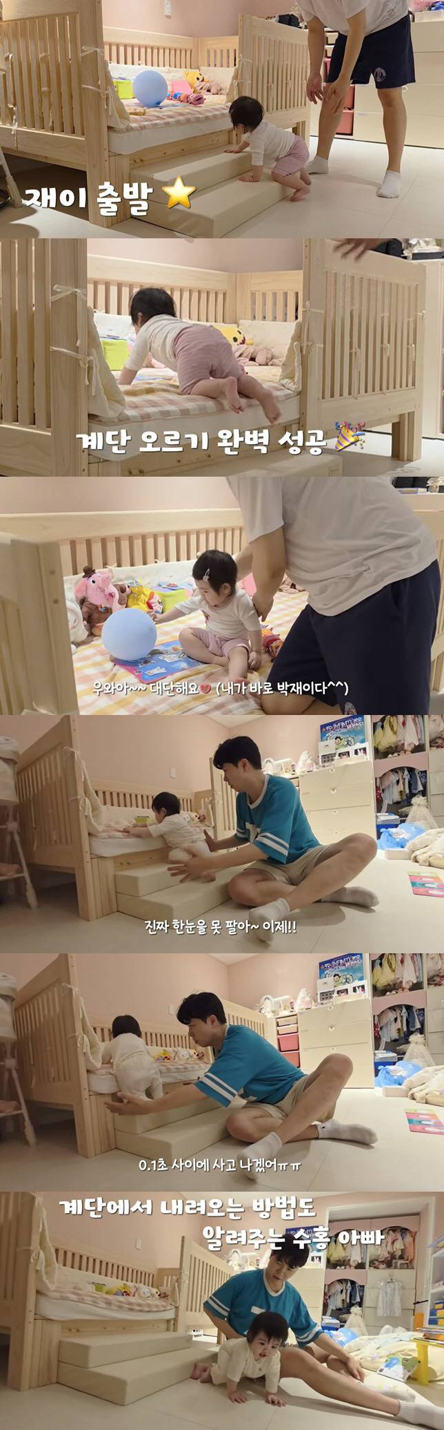 재이 양은 앙증맞은 팔과 다리로 침대 계단을 열심히 올라갔고, 이에 박수홍과 김다예는 "잡고 서는게 아니라 계단을 올라간다"면서 박수쳤다.