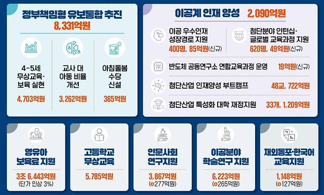 교육부는 수요가 높은 출근 시간대 충분한 돌봄 서비스가 제공될 수 있도록 '아침 돌봄' 교사 수당(1시간)도 신설해 365억원을 투입했다. 어린이집의 안정적인 보육 서비스를 위해 영아(0∼2세) 및 장애아 보육료 단가 3% 인상분도 넣었다.