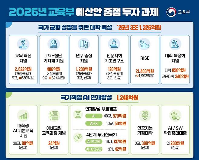 이재명 대통령은 대선 당시 거점국립대 육성을 통한 ‘서울대 10개 만들기’를 교육 공약으로 내건 바 있다. 이번 예산 편성은 이를 뒷받침하기 위한 것으로 보인다. 교육부는 거점국립대학을 지역 기술주도성장을 견인하는 교육·연구 허브로 육성할 계획이다. 교육부는 지역 전략산업과 연계된 집중 육성 분야를 중심으로 9개 거점국립대학의 학부 교육 프로그램을 혁신, 지역 교육 경쟁력을 강화하도록 구상했다. 또 3개 거점국립대학에선 학부 외에도 대학원∙연구소 경쟁력도 높여 세계적 수준의 연구대학으로 도약할 수 있게 관련 사업을 일괄 지원하기로 했다.