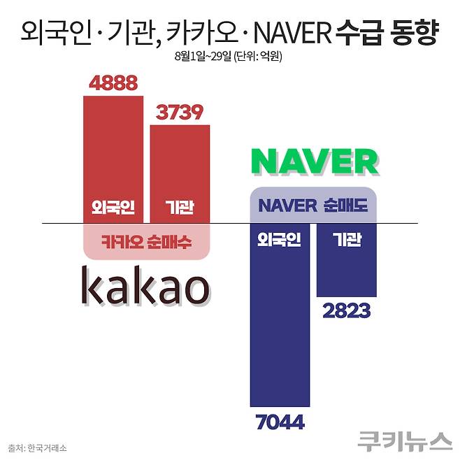 외국인·기관, 8월 NAVER 팔고 카카오 담았다…왜?