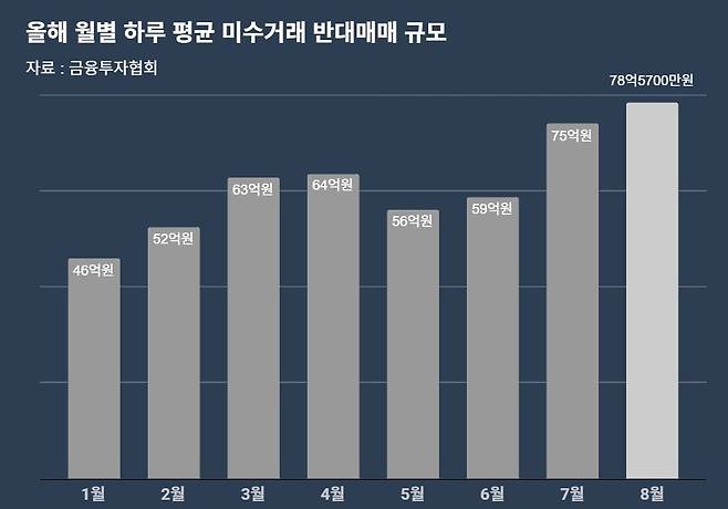 30일 금융투자협회에 따르면 이달 들어(8월 1일~28일) 하루 평균 위탁매매 미수금 대비 반대매매 금액은 78억5800만원으로 나타났다. 올해 들어 최고치이자, 지난해 8월 기록한 하루 평균 100억원에 이어 두 번째로 크다. 미수거래 관련 반대매매만 집계한 만큼 신용거래를 포함한 전체 반대매매 규모는 더 컸을 것으로 보인다.