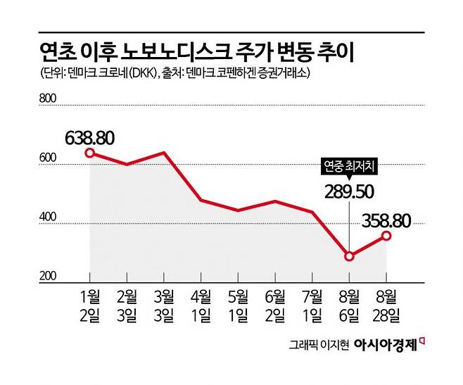 덴마크 코펜하겐 증권거래소에서 지난 28일(현지시간) 노보노디스크의 주가는 358.80크로네(DKK)를 기록했다. 연중 최저치를 기록했던 지난 6일 289.50크로네 대비 23.9% 반등했다. 노보노디스크 주가는 연초 638.80크로네에서 이달 6일까지 계속 내리막길을 걸으며 54.7% 하락했다가 8개월만에 다시 반등세에 들어선 것이다.