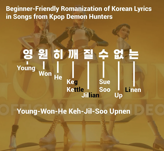 '영원히 깨질 수 없는'은 'Young-Won-He Keh-Jil Soo Upnen'으로 소개했습니다. 철자 하나하나 옮겨 발음하는 것보다 훨씬 자연스럽다고 설명했죠.