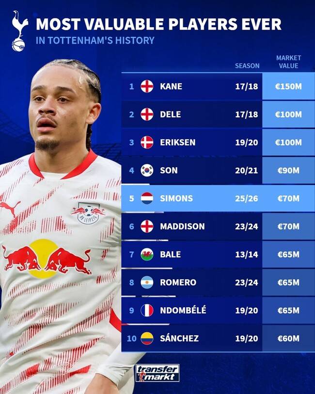 토트넘 홋스퍼가 영입한 사비 시몬스가 구단 역대 시장 가치 5위로 선정됐다.