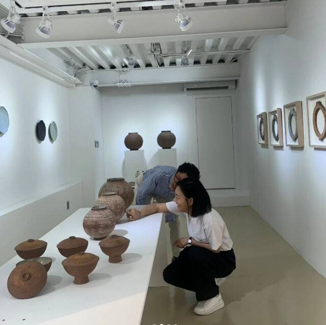 사진 속 장윤정은 밝은 표정으로 전시 공간에서 도자기 작품을 세심하게 감상하는 모습이다.