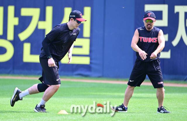 부상에서 복귀한 LG 홍창기가 김용일 트레이너의 지도를 받으며 방향 전환 달리기로 무릎 강화 훈련을 하고 있다.