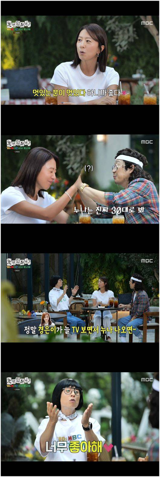 김희애는 "30대로 보여"라고 말했고, 하하는 "누나도 30대로 보여"라고 말했다.
