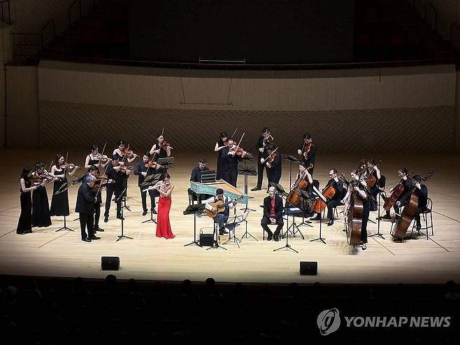 (부산=연합뉴스) 30일 오후 부산 부산진구 부산콘서트홀에서 '베르나르 베르베르X세종솔로이스츠 키마레의 시대' 공연이 진행되고 있다. 음악극 형식인 이 공연에는 프랑스 소설가 베르나르 베르베르가 내레이터로 등장해 이야기의 흐름을 이끌었다. 2025.8.30 [클래식부산 제공. 재판매 및 DB 금지]